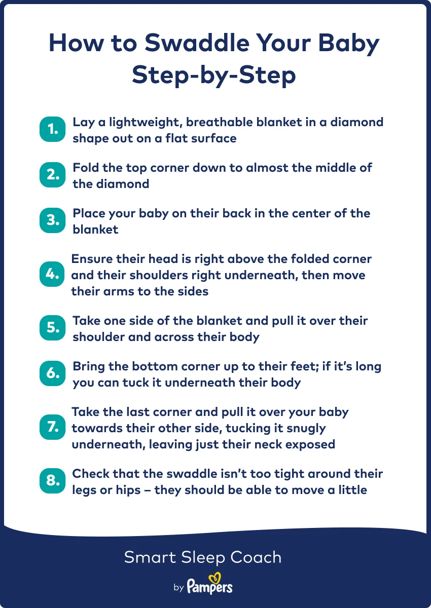 Whether you decide you should swaddle your newborn or not, take this free sleep assessment to get a personalized plan to further support their healthy sleep. Developed by pediatricians and sleep consultants, the Smart Sleep Coach by PampersTM app includes step-by-step guidance and a custom sleep schedule to help you take some of the guesswork out of tackling the first few months of sleep with a newborn.