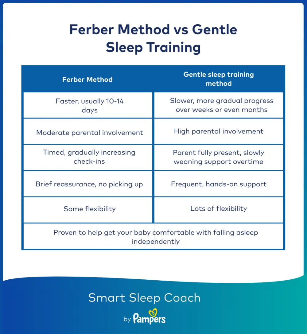 Like all sleep training methods, Ferber and gentle sleep training support the development of your baby’s natural skill of falling asleep independently and help build healthy sleep associations. The main difference is in their approach, and the best option depends on your goals, comfort level, and your baby’s temperament and sleep challenges.