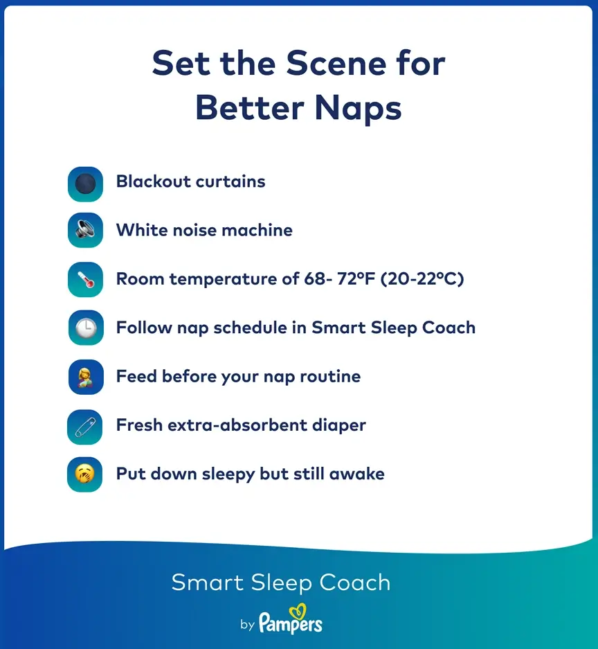 Establishing a nap sleep training schedule starts with understanding your baby’s age-specific sleep needs. The easiest way to create and maintain a consistent schedule is with the Smart Sleep Coach by Pampers app, which automatically adjusts your baby’s nap times based on how each nap goes and how their sleep needs change as they grow.